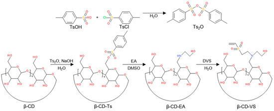 Synthesis of 4-toluenesulfonic anhydride (Ts2O) and three-step modification of β-cyclodextrin (β-CD) to yield 6-deoxy-6-(2-hydroxyethyl) (vinylsulfonyl)methylamino-β-cyclodextrin (β-CD-VS); EA—ethanolamine, DMSO—dimethyl sulfoxide, DVS—divinyl sulfone.