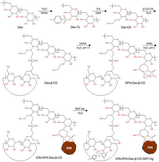 Modification of dextran with tosyl chloride (TsCl), ethanolamine (EA), 6-deoxy-6-(2-hydroxyethyl) (vinylsulfonyl)methylamino-β-cyclodextrin (β-CD-VS) and vinylidene 1,1-diphosphonic acid (VDPA) and conjugation of silver-sulfamethazine (SMT-Ag) to form silver-sulfamethazine-conjugated β-cyclodextrin/dextran-coated iron oxide nanoparticle (ION); DMAc—dimethylacetamide.
