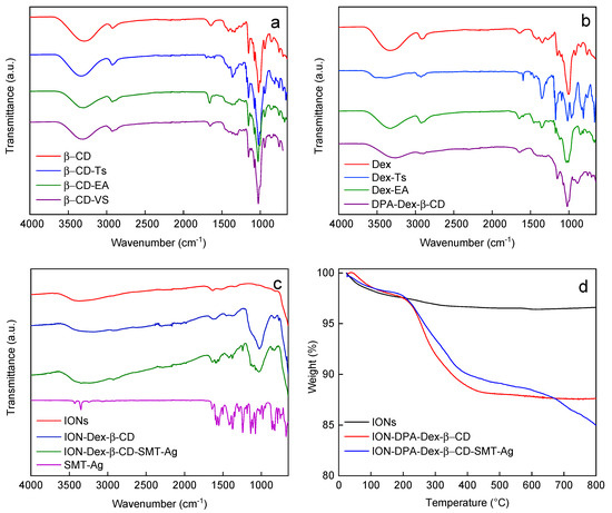 (a–c) FTIR and (d) TGA analysis of IONs, β-CD, β-CD-Ts, β-CD-EA, β-CD-VS, Dex, Dex-Ts, Dex-EA, SMT, DPA-Dex-β-CD, ION-DPA-Dex-β-CD and ION-DPA-Dex-β-CD-SMT.