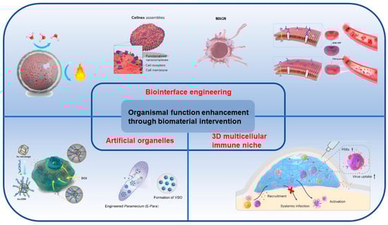 Three strategies to enhance organismal functions through biomaterial intervention, including biointerface engineering, artificial organelles, and 3D multicellular immune niches.