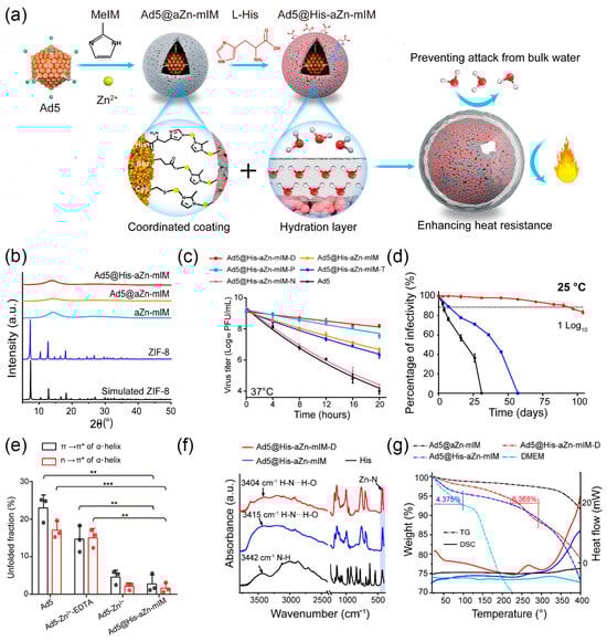 (a) Schematic diagram of Ad5@His-aZn-mIM. (b) Characterization using pXRD patterns. (c) Thermal inactivation kinetics of Ad5@His-aZn-mIM in different biological solutions after being stored at 37 °C (n = 5). (d) The remaining percentages of infectivity at 25 °C over time. (e) Comparison of the unfolded degrees of the π → π* and n → π* transitions of the α-helix following treatment at 25 °C for 6 h. (n = 3, * p < 0.05, ** p < 0.01, *** p < 0.001). (f) FT-IR spectra. (g) TG (dashed line) and DSC (solid line) curves in N2. Reprinted with permission from Ref. []. Copyright (2022) American Chemical Society.