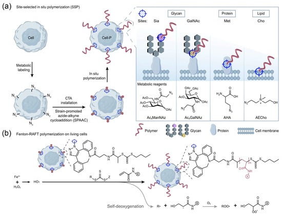 (a) Confinement of the chain transfer agent (CTA) site by metabolic labeling allows polymerization to occur at selected glycan (sialic acid, Sia; GalNAc), protein (methionine, Met), and lipid (choline, Cho) sites on the cell surface. (b) Proposed mechanism of the living cell surface-initiated, self-deoxygenating Fenton-RAFT polymerization reaction. Reprinted with permission from Ref. []. Copyright (2023) Springer Nature.