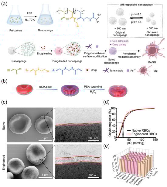 (a) Stimuli-responsive nanosponges capped with metal-phenolic supramolecular gatekeepers anchored on tumor-targeting Mφ (MAGN platform) against metastatic tumors. Reprinted with permission from Ref. []. Copyright (2023) Wiley-VCH. (b) Schematic illustration of the procedure for RBC surface engineering. (c) SEM images (left) and TEM images (right) of human native RBCs and surface-engineered human RBCs. (d) Structural and functional analysis of the native RBCs (black) and engineered RBCs (red). (e) Quantitative intensity of oxyhemoglobin in the liver, spleen, and kidney after injection. Reprinted with permission from Ref. []. Copyright (2020) American Association for the Advancement of Science.