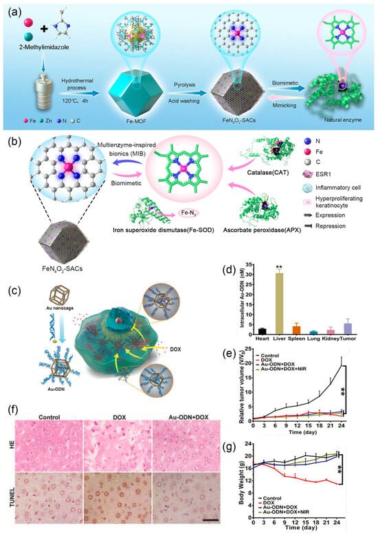 (a) Synthetic process of biomimetic FeN4O2-SACs. (b) Schematic illustration of FeN4O2-SACs for psoriasis catalytic therapy. Reprinted with permission from Ref. []. Copyright (2023) Springer Nature. (c) Schematic of the construction of Au-ODN and its working principle as a nanomaterial-based organelle within the cell. (d) Average Au-ODN concentration within each organ’s cells after injection (** p < 0.01). (e) Normalized tumor growth curves (** p < 0.01). (f) H&E staining and TUNEL analysis of liver slices, the black bar represents 25 µm. (g) Body weights of mice after the different treatments (** p < 0.01). Reprinted with permission from Ref. []. Copyright (2018) Wiley-VCH.