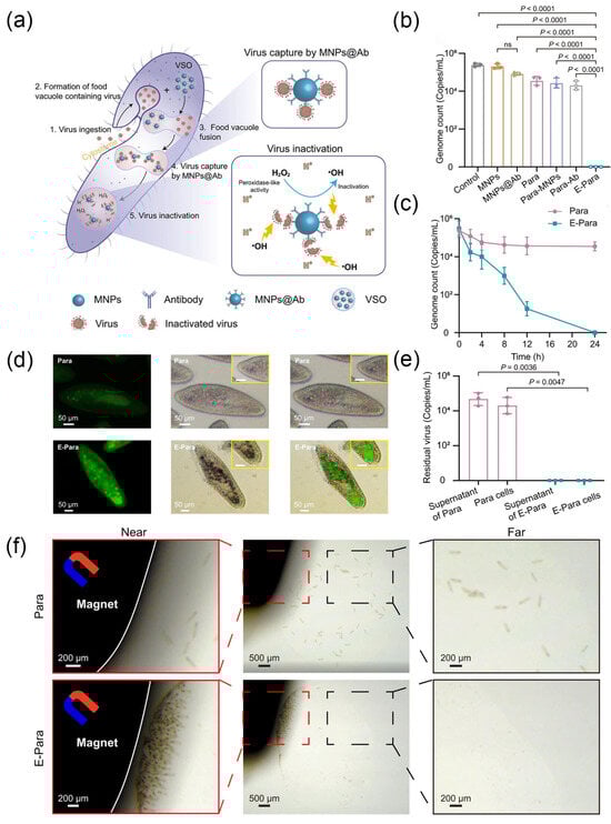 Artificial membrane structures have consistently fallen short in terms of permeability and systemic coordination when compared to natural cell membranes []. Li et al. utilized vacuoles generated during the feeding process of Paramecium caudatum (Para) as microcompartment structures to create a semiartificial organelle capable of effectively clearing waterborne viruses (Figure 7a) []. Although some studies report that Para can ingest certain types of viruses, the virus capture and elimination capabilities are virus specific and less effective []. Therefore, it is not feasible to directly use Para as a strategy for virus removal. The authors designed Fe3O4 magnetic nanoparticles (MNPs) modified with virus-targeting antibodies (MNPs@Ab) and integrated them into the vacuoles of Para via a feed process to introduce a specific virus targeting and scavenging organelle (VSO). Subsequently, engineered Para (E-Para) with VSO, after ingesting viruses, fused vacuole-loaded viruses with VSO, allowing the viruses to be captured by MNPs@Ab (Figure 7b,c). Inside the VSO, the presence of a significant amount of hydrogen peroxide (H2O2) in the acidic environment stimulates the peroxidase-like activity of MNPs, generating ·OH, which effectively inactivate the virus (Figure 7d,e). After capturing the viruses, E-Para could be efficiently collected by external magnets for recovery and reuse, avoiding further contamination (Figure 7f). Finally, the authors replaced the antibodies on MNPs@Ab with sialic acid [], enabling the simultaneous capture of three different viruses in water, demonstrating the universality of this strategy.