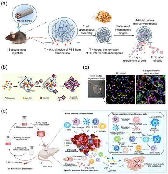 Multicellular communications play a pivotal role in coordinating a myriad of processes throughout tissue homeostasis and immune responses []. Innovations in biomaterials have allowed for the emergence of novel three-dimensional (3D) multicellular structures for immune modulation. Three-dimensional biomaterials with sufficient mechanical strength to withstand tissue pressure, adequate porosity for the ingress and egress of immune cells, and the ability to provide spatiotemporal control over biological signals to regulate immune cell function can recruit a diverse array of immune cells, including granulocytes, monocytes, DCs, macrophages, T cells, and B cells, forming a “multicellular immune niche” []. The in situ reprogramming of host cells and the loading of specific antigens enhance systemic anti-tumor immunity and allow for the establishment of an immunogenic microenvironment, providing opportunities for the continuous delivery of immune modulators or cells at specific locations []. Therefore, they are referred to as artificially synthesized “3D multicellular immune niche”.