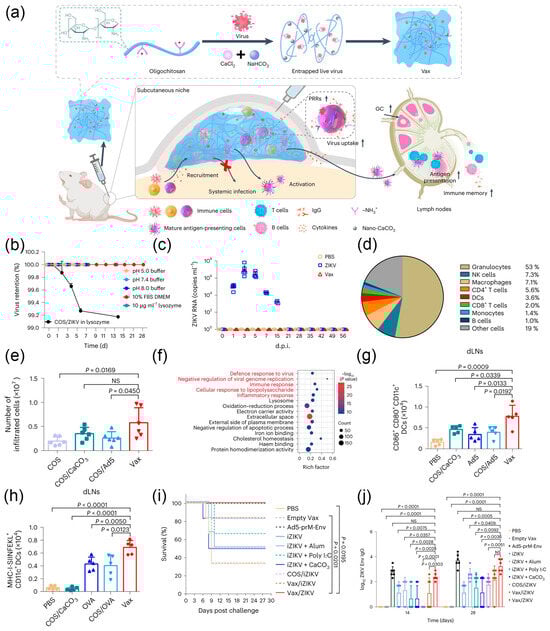 In addition to anti-tumor immunity, 3D multicellular immune niches have been employed in the study of antiviral immunity. Encapsulating viruses in material scaffolds enables the local aggregation of immune cells while preventing leakage, thus constructing an immune factory for the temporal and spatial regulation of interactions between viruses and immune cells. In light of this, Hao et al. proposed a strategy to convert live viruses directly into vaccines using hydrogels. They used wild-type Zika virus (ZIKV) as a model and prepared a live virus-embedded hydrogel named Vax (Figure 9a) []. Positively charged chitosan (COS) was employed to immobilize negatively charged ZIKV virus particles. The gelation characteristics of Vax at 37 °C effectively prevented virus leakage and escape, validated through in vitro release and infection experiments in IFNAR1−/− mice (Figure 9b,c) []. Furthermore, the inclusion of inorganic calcium carbonate nanoparticles (nano-CaCO3) in Vax prevented the degradation of the gel structure in acidic environments and served as a stable Ca2+ source, promoting the rapid recruitment of various immune cells at the injection site to form an immune niche (Figure 9d,e) []. In vivo injection of Vax upregulated pattern recognition receptors (PRRs) of innate antiviral immune responses (Figure 9f), and facilitated immune cell infiltration into the hydrogel for virus engulfment, antigen processing, and cross presentation (Figure 9g,h). Subsequently, immune cells homed to lymph nodes, inducing germinal center (GC) responses, further generating an efficient systemic immune response. After subcutaneous immunization in mice for 28 days followed by viral challenge, the survival rate increased to 100%, demonstrating effective protective effects (Figure 9i,j). This strategy not only provides a new approach for the design of viral vaccines but also exhibits a degree of universality, holding promise for the development of emergency vaccines.