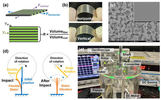 Device design, fabrication, and experimental setup: (a) stiffness modulation through matrix–fiber composite materials. (b) Photo of fabricated flexible stator/rotor with horizontal and vertical patterns. The linewidth in the photos is 500 μm. (c) Surface morphology of the O2-plasma-treated PTFE film with a bar of 5 μm. The inset shows the generally flat PTFE film with a bar of 50 μm. (d) Schematic plot of rotor and stator in impact and after impact. (e) Photo of the assembled FR-TENG with one stator and one rotor mounted on the testing bench.