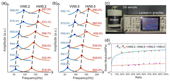 To prove the effectiveness of the stiffness modulation concept, the resonant frequencies of all 24 SS samples were tested. A layer of polyvinylidene fluoride piezoelectric film was stuck onto the SS samples to transform the tension force into electricity, and the SS samples were mounted on the shaker with changing excitation frequency, as shown in Figure 2c. The resonant frequency curves of the 24 SS samples are shown in Figure 2a,b, which ranged from approximately 57.76 to 178.13 Hz. We denominated each SS sample based on pattern direction (H/V), linewidth (W), and volume ratio (R), so that HW0.2R18.4% represents an SS sample with a horizontal direction, linewidth of 0.2 mm, and volume ratio of 18.4%. The resonant frequency of each SS sample corresponded to the frequency at which the amplitude of the electrical signal reached the maximum. Generally, for each linewidth, resonant frequency increased as the volume ratio increased. For the same linewidth, SS samples with vertical patterns exhibited a lower resonant frequency than those with horizontal patterns. This is in accordance with Equations (2) and (3), as the elastic modulus EV is lower than EH. Figure 2d compares the theoretical and experimental elastic moduli for all 24 SS samples, which agree well with each other. Slight deviations might have been due to measurement errors and the additional stiffness effect caused by the stuck piezoelectric layer.