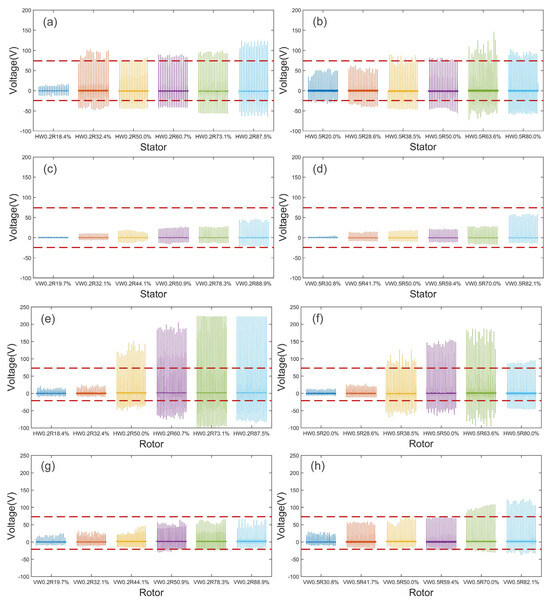 Output voltage curves of stiffness-modulated FR-TENG: (a–d) solid rotor vs. various SS–PTFE stators; (e–h) solid stator vs. various SS/PTFE rotors. (a,e) HW0.2 samples; (b,f) HW0.5 samples; (c,g) VW0.2 samples; (d,h) VW0.5 samples. For comparison, the dashed lines in all subplots show the voltage range generated by solid stator vs. solid rotor.