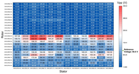 Cross-referenced peak-to-peak voltage generated by all 24 SS/PTFE rotors with 12 horizontal SS/PTFE stators. The reference voltage is 90.5 V.