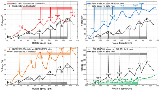 Oscillating voltage-rotation speed relationships for different SSPTFE combinations: (a) HW0. 87.5% vs. untreated SS; (b) untreated SS vs. HW0.2R87.5%; (c) HW0.2R87.5% vs. HW0.5R80%; (d) HW0.2R87.5% vs. HW0.2R18.4%. In all four subplots, the dark grey line is generated by solid rotor and solid stator for comparison.