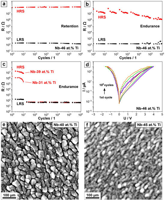 (a) Retention of the HRS and LRS values of the Nb-46 at.% Ti memristor. (b) Endurance of the Nb-46 at.% Ti memristor. (c) Endurance of the memristors for the compositions in a range of Nb-31 at.% Ti to Nb-39 at.% Ti. (d) I–U sweeps after each decade during the endurance measurement for the Nb-46 at.% Ti. SEM images of (e) Nb-40 at.% Ti and (f) Nb-45 at.% Ti metallic thin films.