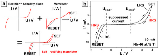 In Figure 4b, the I–U sweep corresponding to the Nb-46 at.% Ti anodic memristor is presented, and its similarity to the typical self-rectifying memristor behaviour is evident. At the start of the I–U sweep, the memristor is in a HRS. By applying a positive bias, the current starts to increase significantly only after approximately U = 2 V, which is defined as a hold voltage (UHOLD+). This is the voltage at which the current starts to increase following a suppressed state. After reaching an SET voltage of USET = 4 V, the memristor is switched to the LRS. Next, by decreasing the voltage, at UHOLD+ = 2 V, the LRS current is suppressed again. By further lowering the voltage towards a negative bias, the current starts to increase again at approximately UHOLD− = −0.5 V until it reaches URESET = −1.5 V, where the LRS switches back to the HRS. The strong current suppression part of the I–U curve, defined by the two holding potentials (UHOLD), is a typical characteristic of a self-rectifying memristor. Self-rectifying behaviour is often attributed to the interfacial type of the memristors due to the formation of the Schottky barriers, which determine their switching mechanism [6,39,41].