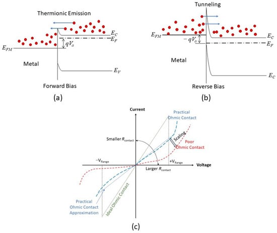 Ohmic contact and current-conducting mechanisms: (a) forward bias; (b) reverse bias. (c) Illustration of the current–voltage characteristics of an ideal ohmic contact, practical ohmic contact, and poor ohmic contact that may result from downsizing.