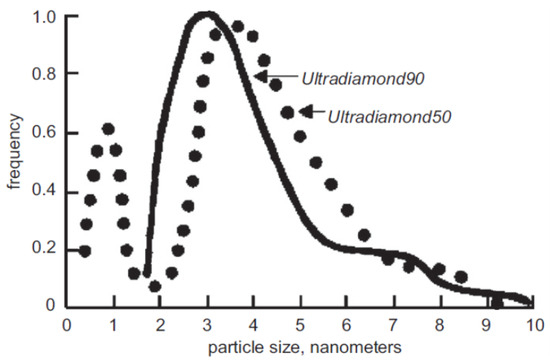 Thus, the simple estimates show that NDs are the most promising material for designing a VCN reflector due to the unique combination of their properties: a large amplitude of coherent scattering, a small capture cross-section for carbon atoms, and a high nuclear concentration of these atoms in the diamond phase. A sufficiently thick layer of ND powder with a particle size (diameter) of several should give a large albedo for VCNs. At the same time, this powder will be inefficient for thermal neutrons and CNs [90]. Of course, the real situation is much more complicated, since the simplest consideration presented above did not take into account that real NDs can have different shapes, and NDs in a powder can have a certain size distribution and can be combined into agglomerates, etc. As can be seen from Figure 2, the optimal sizes of NDs for reflecting neutrons with velocities of 30–110 m/s lie in the range of 7–2 nm. Luckily, the main amount of NDs produced via detonation synthesis lies in the same range.
