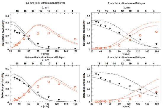 The probability of detecting VCNs scattered on an Ultradiamond90 sample (normalized to the incident neutron flux) into the forward hemisphere (the sum of events in the detectors located at the angles of 30°, 60°, 300°, and 330°) and the rear hemisphere (the sum of events in the detectors located at the angles of 120°, 150°, 210°, and 240°) as a function of VCN velocity (bottom scale) and wavelength (top scale), for various powder thicknesses. Triangles correspond to the measured VCN backscattering probability. Circles stand for the VCN forward scattering probability. The dotted lines correspond to the model of independent nanoparticles at rest without taking into account the losses due to hydrogen impurities. Solid lines indicate the model taking into account the “heating” of VCNs on hydrogen impurities. Dotted lines correspond to the model ignoring the “heating” of VCNs on hydrogen impurities. The experimental scheme is shown in Figure 3. A similar figure is given in ref. [64].