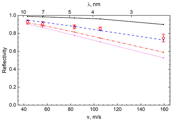 Probability of VCN reflection from a layer of DNDs at ambient temperature as a function of their velocity and wavelength. Open circles correspond to the measurements at room temperature [65]. Thin lines stand for the Monte Carlo calculations taking into account inelastic scattering of neutrons on hydrogen, with different values of inelastic scattering cross-section reduced to the neutron velocity of 2200 m/s: for pink dashed line, for red dashed line, for dotted blue line, and for black line. A similar figure is given in ref. [65].