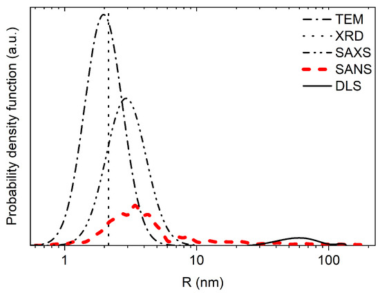 To study the properties of NDs, a wide range of both chemical and physical methods are used. Scientists working in different areas of research, when determining the properties of NDs, often use “standard” (for them) research methods, the results of which can differ significantly. For example, the crystal lattice parameters determined from X-ray diffraction (XRD) [14] and neutron diffraction [15] usually agree well with each other, while the characteristic ND sizes determined from the results of small-angle neutron scattering (SANS) and small-angle X-ray scattering (SAXS) [16] usually give much smaller values than those from the results of dynamic light scattering (DLS) [17], since the latter are highly sensitive to ND clusters [18,19,20]. The emergence of a potentially new field of application for NDs and the corresponding shift in the focus of research often enriches our understanding of NDs with new data.