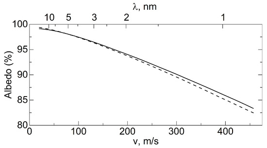 where is the average neutron path in the trap between the walls, v is the neutron velocity, is the measured storage time, and is a geometric coefficient equal to the ratio of the probability of loss of VCNs in the input and output windows to the total probability of VCN losses in the trap; its value is . The uncertainties in this estimate are given by the uncertainty of the storage time, the mean range , and the neutron velocity. This probability characterizes the reflectivity of the trap walls. It includes losses in the aluminum foil and the effect of the geometry of the trap walls. This estimate assumes an isotropic angular distribution of the VCNs in the trap, which is not entirely true for faster neutrons. For a better assessment, calculations were performed using the Monte Carlo method. The resulting reflectivity is shown in Figure 8 in terms of the albedo as a function of the neutron velocity and wavelength.