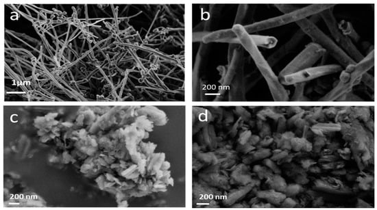 SEM images of CNFs before fluorination (a), after fluorination (b), and fluorinated after grinding in air (c) and in argon (d).