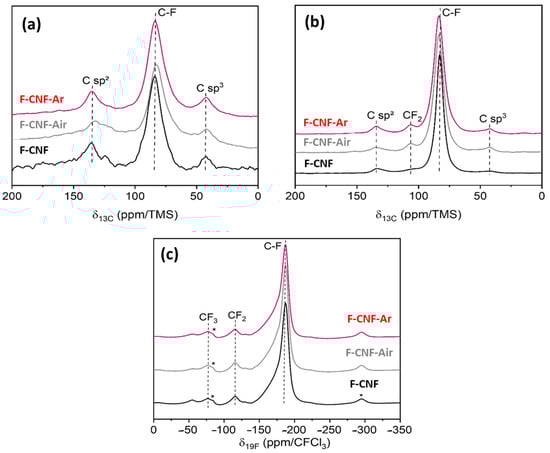 The 19F→13C cross-polarization spectra of the CNF compounds before and after grinding (Figure 4b) confirm what has already been stated with the 13C and 19F NMR. The resonance peak corresponds to covalent C-F bonds at 82.9 ppm for the F-CNF and 83.5 ppm for the milled F-CNF-air and F-CNF-Ar. The CP-MAS NMR highlights the peaks of carbons bonded to fluorine atoms; this is why a slightly higher intensity can be seen for CF2 at 110 ppm. Such an observation does not indicate an increase in the number of CF2 groups after grinding, as this would be impossible without the addition of fluorine. The graphitic sp2 carbons, located at 134.0 ppm, are more present after grinding, particularly after grinding under argon. The sp2 carbons provide better electronic conductivity within the material, resulting in a better-operating potential for the cell []. These NMR spectra also demonstrate the change in the covalency of the C-F bonds by the broadening of the C-F peak for the ground compounds. Before milling, the width at half-height of this peak is 6.9 ppm for the F-CNF, and this value increases to 9.7ppm for the compounds milled in air and argon.