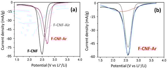 The F-CNF has a reduction peak centered at 2.48 V, corresponding to the breaking of C-F bonds. After milling, the reduction peak for the F-CNF-Air is centered at 2.58 V and 2.70 V for the F-CNF-Ar. The potential increases after milling, reflecting either a weakening of the C-F bonds or changes at the electrode/electrolyte interface. These results are in line with what was discussed in the physicochemical characterization of the materials. In addition to the potential, the shape of the reduction peak and its width at half-height provide other information. Before grinding, the reduction peak for the F-CNF has a half-value width of 0.265 V. After grinding in air, this value increases to 0.307 V, meaning that the nature of the bonds is less homogeneous in this compound. In addition, the reduction peak of the F-CNF-Air is asymmetric and can be deconvoluted into two Gaussian components corresponding to either two types of C-F bonds or two electrochemical processes with different activation energies (Figure 5b). In the first hypothesis, the F-CNF-Air would be then composed of 41% covalent C-F bonds with a reduction peak centered at 2.35 V, and 59% weaker C-F bonds centered at 2.59 V. The peak is thinner than after grinding in air, which means that the electrochemical active sites are more homogeneous. After milling under argon, the width at half-height of the reduction peak for the F-CNF-Ar is 0.267 V. The fit of the reduction peak leads to 71% of weakened C-F bonds being centered at a potential of 2.69 V and 29% of stronger bonds at 2.49 V. The hypothesis of the two types of C-F bonds is not corroborated by the physico-chemical characterization; neither IR spectroscopy nor NMR data evidence weakened C-F bonds in these high amounts (59 and 71%). Although close C-F bonding, structures, contents of CF2 groups, and morphologies are known for the milled CNF, the discharge potentials depend on the atmosphere of milling. It is known that the electrochemical behavior of covalent fluorinated carbons is strongly related to their insulating character at the beginning of the process and the accumulation of LiF on the sheet edges for a higher depth of discharge (DoD). It is important to deeply investigate the galvanostatic curves for the very low DoD (Figure 6a,b). Due to the sub-fluorination, a small potential drop (0.2 V) is recorded for the F-CNF. The over-potential, typical of CFx, is suppressed after milling. The electrochemical process is even initiated at a higher potential for the F-CNF-Air (3.2 V). This enhancement is explained by the presence of conductive sp2 carbons of two origins: (i) those formed by the milling, by IR data, and (ii) those already present in the fiber core because of the sub-fluorination and made accessible for the electrolyte by the milling. The defluorination of CFx was evidenced during the tests to establish their tribological properties, in particular for the F-CNF []. Back to the physicochemical characterization, the only difference appears on IR spectra, with the presence of oxygenated groups (C=O) when the milling is carried out in the air (Figure 3). It is important to note that the suppression of the over-potential is not achieved with micrometric F-Gr milled in argon (Figure S5).