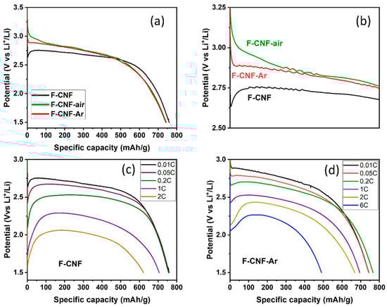 To study the influence of grinding on electrochemical performance, the F-CNF and the F-CNF-Ar were tested at different discharge rates up to 6C. Applied current densities, obtained capacities (Qexp), potentials at half-discharge (E1/2), and corresponding specific energy densities are summarized in Table 1 for the F-CNF-raw, and in Table 2 for the CNF-Argon. The galvanostatic discharge curves based upon various current densities of the F-CNF and F-CNF-Ar are represented in Figure 6a–d, respectively.