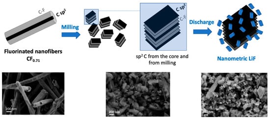Carbon nanofibers had initially been chosen for their sub-fluorination capacity (CF0.71), namely, a non-fluorinated core that facilitates the flow of electrons during the electrochemical process, and therefore the power density. These core sp2 carbons do not disappear during grinding and are supplemented by a second level of sub-fluorination with sp2 C created by grinding (Figure 7). In addition, the structure, which initially consisted of multi-walled tubes, is «opened» by grinding, with two benefits: (i) easier diffusion of Li+ and F− ions due to the nanometric size of the CFx and (ii) the formation of LiF distributed on the many plane edges, facilitating electroreduction. Both the Faradic yield and power benefit from this particular configuration.