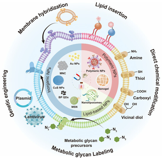 To imbue cell membranes with sophisticated functionalities, techniques in cell membrane engineering have been devised and extensively utilized [165]. These methods represent a pioneering fusion of synthetic nanomaterials with biological systems and enrich nanoparticles with a spectrum of biological capabilities. Within this review, we provide a concise collation of the predominant techniques employed in cell membrane engineering including lipid insertion, membrane hybridization, direct chemical modification, metabolic glycan labeling, and genetic engineering. Each methodology is dissected to unravel its underlying principles, alongside a critical examination of its merits and limitations, with a focus on the novel functionalities elicited in nanoparticles through cell membrane engineering. Grounded on this framework, we delineate the advancements in research on nanoparticles camouflaged with engineered cell membranes across various biomedical domains. This review not only augments comprehension of the field’s progression but also illuminates the path toward more profound investigations.