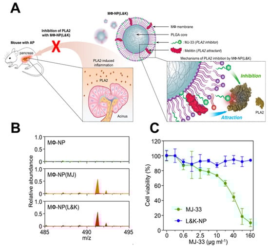 Construction of a nano platform for insertion of melittin into cell membranes. (A) The membrane of MΦ can be used as a coating material to divert PLA2 from its intended target cell. (B) A molecular ion peak was identified at m/z = 491.3, which corresponds to the theoretical molecular weight of MJ−33. This indicates that MJ−33 was successfully loaded into the nanoparticle formulations. (C) While free MJ−33 was found to be toxic to macrophages, MΦ−NP(L&K) containing the same amount of MJ−33 was non−toxic. (MΦ: macrophages; AP: acute pancreatitis; PLA2: phospholipase A2; PLGA: polylactic acid−co−glycolic acid; MJ−33: PLA2 inhibitor). Reprinted from [29] with permission from Springer Nature, open access, copyright 2021.