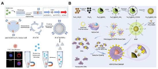(A) Schematic illustration of overexpressing scFv of the EGFR antibody on the surface of the Jurkat cell membrane and cell membrane-camouflaged MNs. JE-CM-MNs were shown to maintain specific recognition of EGFR-positive CTCs. Scale bar = 5 µm. (ScFv: single-chain variable fragment; JE-CM: chimeric antibody membrane). Reprinted from [121] with permission from Wiley, copyright 2023. (B) The method of preparing HDFGFR4/CMMNPs. (FGFR4: fibroblast growth factor receptor 4). Reprinted from [127] with permission from ACS Applied Materials & Interfaces, copyright 2023.