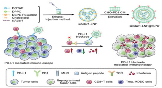 The LNP was loaded with synthetic ADAR1-siRNA with high encapsulation efficiency. Afterward, a layer of GECM with PD1 overexpression was coated onto the siAdar1-loaded LN. (siAdar1-LNP@mPD1: a layer of GECM with PD1 overexpression was coated onto the siAdar1-loaded LNP; siAdar1: small interfering RNA against ADAR1; LNP: lipid nanoparticle; ADAR1: adenosine deaminases acting on RNA; ICB: immune checkpoint blockade; GECMs: genetically engineered cell membranes; siAdar1-LNP@mPD1: siAdar1-loaded LNP was coated with a layer of the GECM with PD1 overexpression; siAdar1-LNP: LNPs to deliver ADAR1-targeted siRNA; MHC: major histocompatibility complex). Reprinted from [99] with permission from Cell Press, copyright 2023.