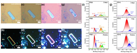 Degradation of VP flakes in ambient conditions. (a–h) The degradation process of an exfoliated VP flake after various air exposure times. (a,b) Bright-field (BF) and dark-field (DF) optical micrographs of the just exfoliated VP flake. (c,d) BF and DF optical micrographs of the VP flake after 2 h of air exposure, (e,f) after 1 day, and (g,h) after 2 days. (i,j) XPS P(2p) and O(1s) cores of a bulk VP crystal. The panels (from bottom to top) show the XPS spectra for the VP crystal in the pristine state, after 1 day of air exposure, and after 2 days of exposure, respectively.