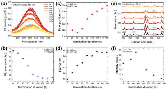 Raman and photoluminescence spectroscopy are effective and universally used characterization tools for layer-thickness identification [37,38,39], doping analysis [37,40,41,42,43], and defect detection [44] of nanomaterials. According to this, we conducted PL and Raman measurements on VP flakes at various illumination durations. The corresponding illumination-duration-resolved data are presented in Figure 3. Figure 3a exhibits the PL spectra of an initial 153 nm thick VP at various illumination durations, revealing a clear dependence of PL on illumination duration. Specifically, as plotted in Figure 3b, the relative PL intensity of the VP sample declined from approximately 83 to around 25 when the illumination duration increased from 0 s to 160 s. At the same time, with increasing illumination duration, the full width at half maximum (FWHM) increased monotonically, as shown in Figure 3d. What differed was that the peak position initially displayed a blueshift from about 622 nm to approximately 619 nm until the illumination duration of 40 s, then it underwent a redshift and ultimately reached approximately 628 nm, as shown in Figure 3c. The observed trends in PL intensity and FWHM evolution may result from illumination-induced defects and thickness thinning of the VP. Since the optical bandgap of VP is thickness-dependent, thickness thinning would modify its optical bandgap, while defects can introduce new energy states and levels, both potentially leading to PL-intensity quenching and FWHM broadening.