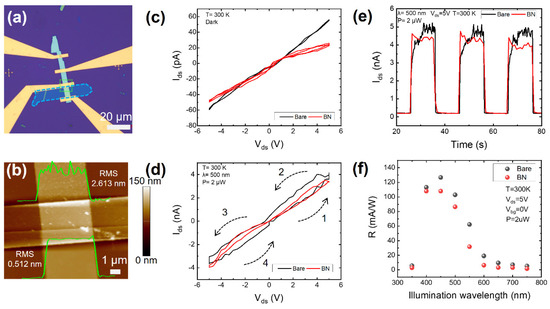Furthermore, we conducted electrical and optoelectrical measurements on the as-fabricated VP device. Figure 4c presents the electrical-transport properties of the bare (black) and hBN-passivated (red) channels under dark conditions; it seems that the bare channel demonstrates a higher current than the BN-passivated channel at an identical bias. This indicates a lower resistance for the bare channel, given the same channel width and length. This difference might arise from the adsorbate-doping-induced carrier density improvement within the bare channel [46,47,48]. Upon illumination, as shown in Figure S7a,c, both the bare and hBN-passivated channels demonstrate a prominent photoresponse within the visible range (350~750 nm). Notably, both the bare and hBN-passivated channels show photocurrent hysteresis with a scanning bias. Nevertheless, the hysteresis is more pronounced for the bare channel across all examined illumination wavelengths, as exemplified by the I-V curves illuminated by 500 nm that is plotted in Figure 4d. This observed hysteresis discrepancy between the bare and hBN-passivated channels can also be interpreted due to adsorbate-induced effects [49]. The adsorbates on the bare channel could trap photogenerated carriers of one polarity, leaving behind photocarriers with the opposite polarity to transport across the channel under an applied bias. As the bias increases forward from 0 to ±5 V (steps 1 and 3 labeled in Figure 4d, respectively), the carrier in the channel would transport at an increasingly faster speed, debilitating the photocarrier recombination and thus improving the photogain, as reflected by the increasing photoconductance. Conversely, as the bias decreases backward from ±5 V to 0 (steps 2 and 4, respectively), the increasing carrier transit time in the channel would boost the photocarrier recombination, weakening the photogain, signified by a decreasing photoconductance. Therefore, the bare channel holding more adsorbates would readily demonstrate a more noticeable photocurrent hysteresis in comparison with the hBN-passivated channel.