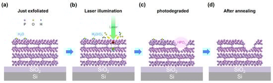 Schematic illustration of the photodegradation and annealing effects on a VP flake. (a–c) The VP flake in different states. (a) The VP flake that has just been exfoliated onto a silicon oxide substrate, with H2O molecules adsorbed on its surface after an instant exposure to the air; atoms of different elements are distinguished by various colors and sizes. (b) The VP flake undergoing 532 nm laser illumination. (c) The VP flake after photodegradation. (d) The VP flake after nitrogen-gas thermal annealing.