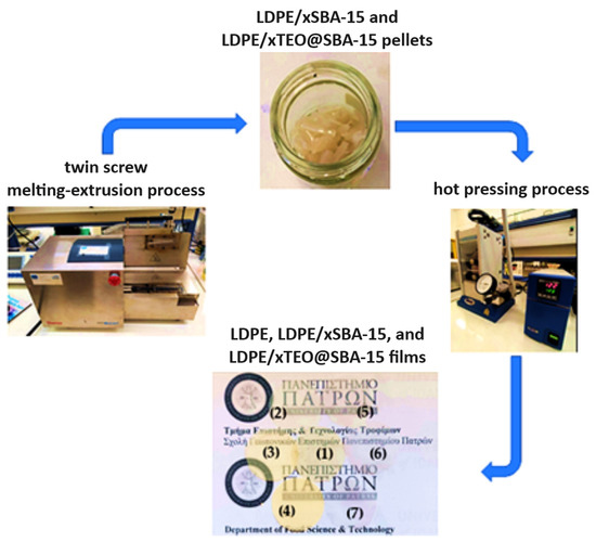 A Mini Lab twin-screw extruder (Haake Mini Lab II, Thermo Scientific, ANTISEL, S.A., Athens, Greece) was operated at 140 °C and 100 rpm screw rotation for 3 min to produce LDPE/xSBA-15 and LDPE/xTEO@SBA-15 films [24]. Appropriate amounts of LDPE granules, SBA-15 powder, and TEO@SBA-15 powder were mixed to achieve final LDPE/xSBA-15 and LDPE/xTEO@SBA-15 materials where x = 5, 10, and 15 wt.% nominal concentrations. A pure LDPE sample was also prepared using the twin-screw extruder. The materials obtained after the extrusion process were transformed into films via a thermomechanical process using a hydraulic press with heated platens. Approximately 1.4 g of pellets were heated/pressed at 110 °C under a constant pressure of 2 MPa to obtain films with a 10 cm diameter and an average thickness of 0.10–0.25 mm. The overall process is depicted in Figure 1.