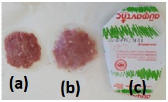 Fresh minced pork meat was provided by a local meat processing plant (Aifantis Company-Aifantis Group—Head Quarters, Acheloos Bridge, Agrinio, Greece 30100) and immediately transported to the laboratory. For the packaging test, LDPE and LDPE/10TEO@SBA-15 films with approx. diameter of 10 cm and approx. thickness of 0.10 mm were used. For the packaging, the packaging paper from the local meat processing plant was used. From this packaging paper, the internal side packaging film was removed prior to use. Approximately 25 g of fresh pork minced meat were wrapped inside two LDPE or LDPE/10TEO@SBA-15 films and then wrapped with the paper package used by the processing plant (see Figure 2).