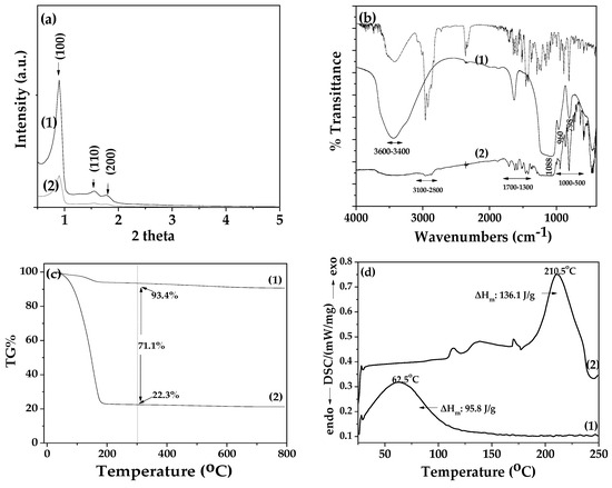 The XRD plot of pure SBA-15 (see Figure 3a line 1) exhibits a single high-intensity peak (100) at 2Ɵ value of 0.96°, followed by two additional smaller peaks, at (110) and (200), at 2Ɵ lower than 2°, which confirms the formation of a hexagonal lattice of p6mm symmetry [26,30,34,48]. On the contrary, in the XRD plot of the modified TEO@SBA-15 nanohybrid (see Figure 3a line 2) the adsorption of TEO molecules gave rise to a strong decrease in the intensity of the characteristic reflections of SBA-15. This should be attributed to the pore-filling effects due to the adsorption of TEO molecules in the inner space of SBA-15’s hexagonal structure, which can reduce the scattering contrast between the pores and the silica walls [30].