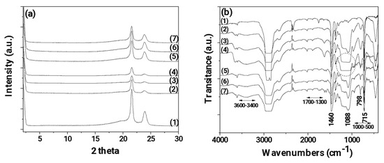 (a) X-ray diffraction (XRD) plots of pure LDPE and all LDPE/xSBA-15 and LDPE/TEO@SBA-15 films; (b) Fourier Transform Infrared (FTIR) plots of pure LDPE and all LDPE/xSBA-15 and LDPE/TEO@SBA-15 films. (1) pure LDPE, (2) LDPE/5SBA-15, (3) LDPE/10SBA-15, (4) LDPE/15SBA-15, (5) LDPE/5TEO@SBA-15, (6) LDPE/10TEO@SBA-15, (7) LDPE/15TEO@SBA-15.