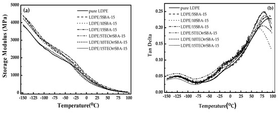 Figure 5a presents the data of the storage modulus as a function of temperature from sub-glass transition temperature (T < Tg) up to 100 °C, and Figure 5b presents the tan δ values as a function of temperature for all LDPE/xSBA-15, LDPE/xTTEO@SBA-15 films, as well as pure LDPE film.