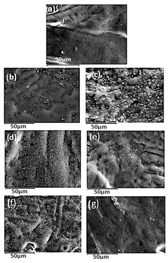 SEM micrographs of (a) LDPE (b) LDPE/5SBA-15 (c) LDPE/5TEO@SBA-15 (d) LDPE/10SBA-15 (e) LDPE/10TEO@SBA-15 (f) LDPE/15SBA-15 (g) LDPE/15TEO@SBA-15.