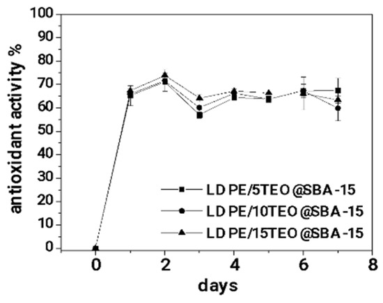 As it is observed in Figure 7 all the obtained LDPE/xTEO@SBA-15 active films achieve a high % total antioxidant activity in the range of 65–70%. In addition, the % total antioxidant activity for all obtained LDPE/xTEO@SBA-15 active films was achieved after 48 h and remained almost constant for seven days (one weak).