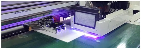 The photograph of the UV–digital printer prototype with implemented HDCSBD technology during UV-LED curing (legally protected by outcomes listed in Section 5).