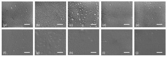 SEM images of PMMA (a–e) and PC (f,j) after different HDCSBD treatment conditions: reference sample (a,f), treated at 300 μm distance for 3 s (b,g) and 5 s (c,h), treated at 450 μm distance for 3 s (d,i) and 5 s (e,j) (scale: 1 μm).