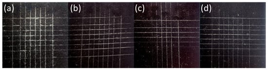 Detail of the black pattern on PC samples after the crosscut and tape test right after the printing: (a) reference and treated for (b) 1 s, (c) 3 s, and (d) 5 s.