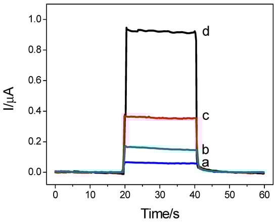 The PEC properties of the prepared sensor were investigated by measuring the photocurrent on different modified electrodes at a working voltage of 0.0 V under visible light illumination. Figure 3 shows that WS2/ITO and CdS/ITO had a weak photocurrent of 0.06 μA (curve a) and 0.16 μA (curve b), respectively, which can be attributed to the fact that the single photosensitive material exhibits insufficient separation of electrons and holes and the high recombination rate of photogenerated charges under visible light irradiation. In a great comparison, the CdS/WS2/ITO electrode produced an obvious ascended photocurrent of 0.35 μA (curve c), which was an approximately 6-fold increase compared to that of WS2/ITO and a 2-fold increase compared to that of CdS/ITO. This demonstrates that the CdS-WS2 heterostructure can effectively inhibit the recombination of charge carriers, resulting in significantly improved photoelectric conversion efficiency and enhanced photoelectrochemical activity. As seen in curve d, the CdS/WS2/ITO electrode showed an enhanced photocurrent of 0.93 μA when 10 μM cysteine was present, indicating that cysteine as an electron donor can effectively promote the separation of electron–hole pairs, which leads to further ascent of the photocurrent response.