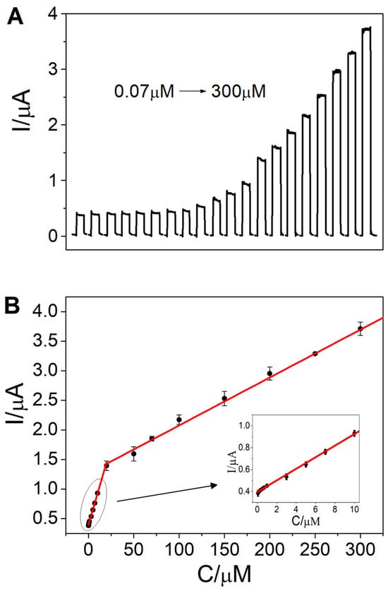 Figure 4A illustrates the photocurrent responses of the PEC sensor in different concentrations of cysteine under the optimum conditions, in which the photocurrent gradually increased along with the concentration. The sensor had a linear response in the 0.07 to 300 μM cysteine concentration range with a detection limit of 5.29 nM based on 3σ/S. As shown in Figure 4B, the regression equation was I (μA) = 0.3954 + 0.05294 c (μM) (R = 0.9973) in the concentration range of 0.07–20 μM and I (μA) = 1.2659 + 0.0081c (μM) (R = 0.9983) in the concentration range of 20–300 μM. In comparison to previously reported PEC methods, the PEC sensor described in the present work possesses a wider linear response range and higher sensitivity, demonstrating its exceptional analytical performance in detecting cysteine (Table 1). Furthermore, the proposed PEC sensor showed the outstanding advantages of simple structure, convenient operation, economy and fast detection.