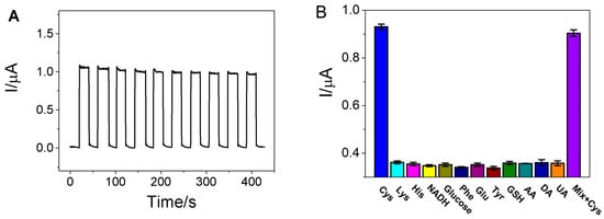 (A) Time-based photocurrent response of the sensor under ten on/off irradiation cycles. (B) Photocurrent responses of the sensor towards 10 μM of cysteine and 50 μM of other interference substances.